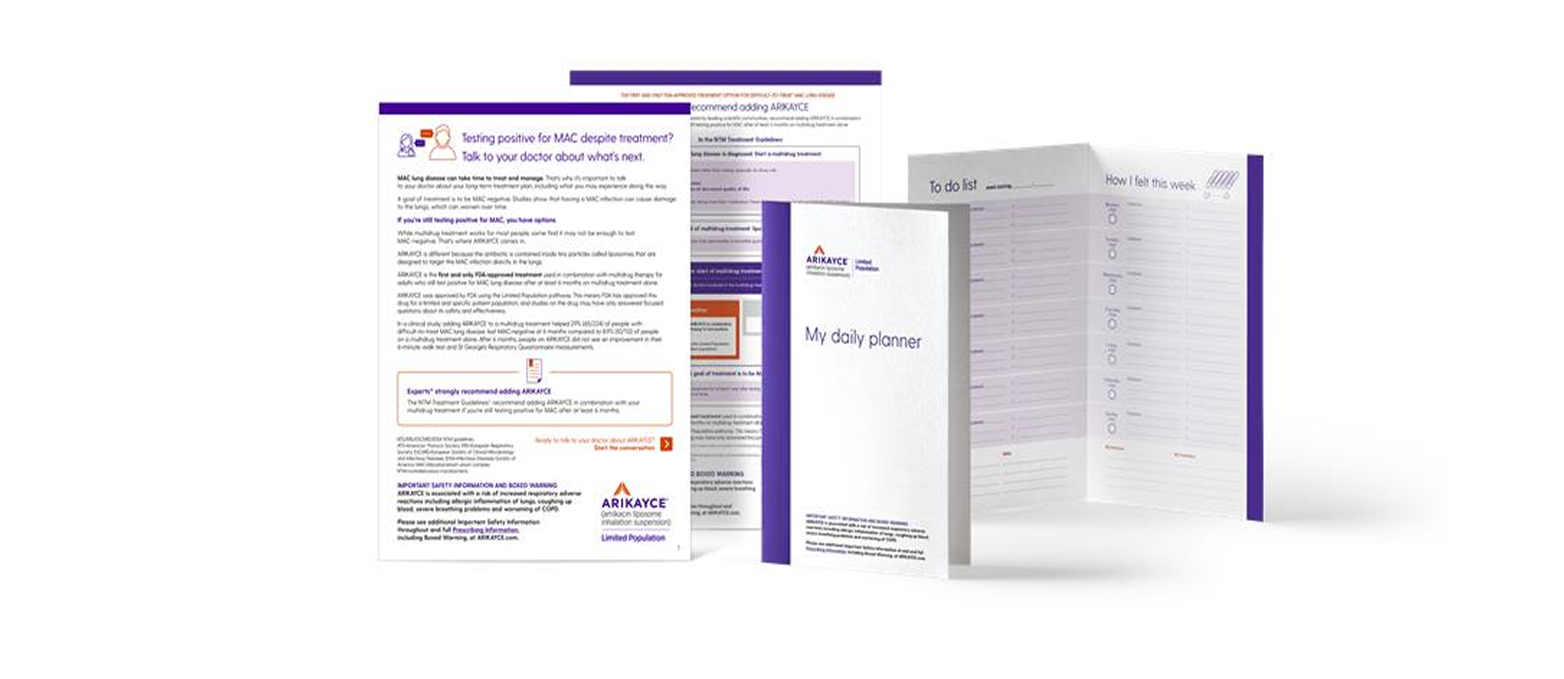 ARIKAYCE is used in combination with multidrug therapy for adults who still test positive for MAC lung disease after at least 6 months on multidrug treatment alone.